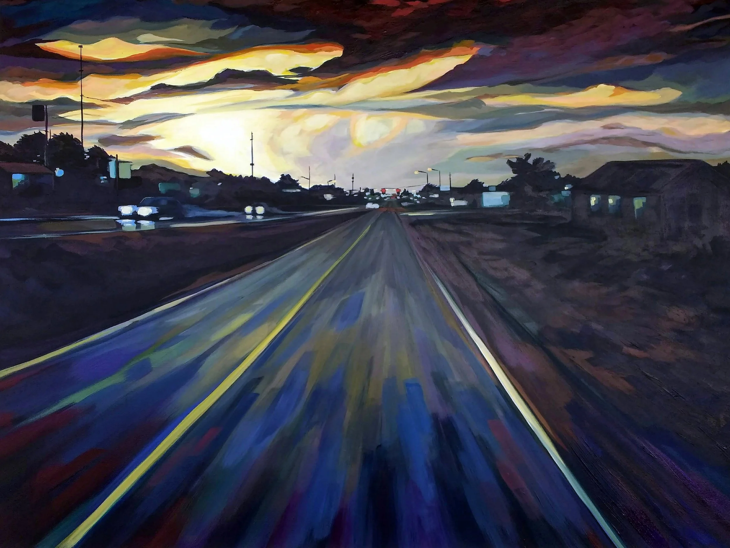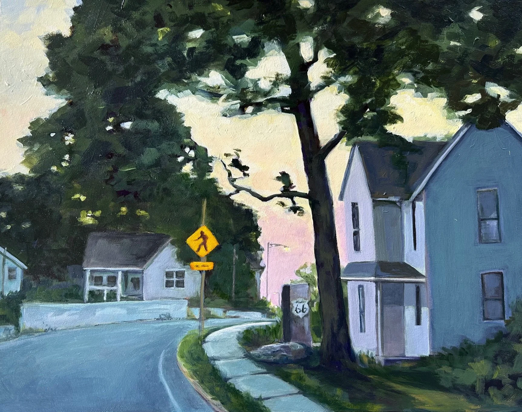 Wanderers Pause, Route 66 captures a quiet stretch of West College Street along the historic Route 66 corridor in Springfield, Missouri. Soft evening light settles over the homes and roadway, reflecting a moment of stillness along a path once defined by movement.