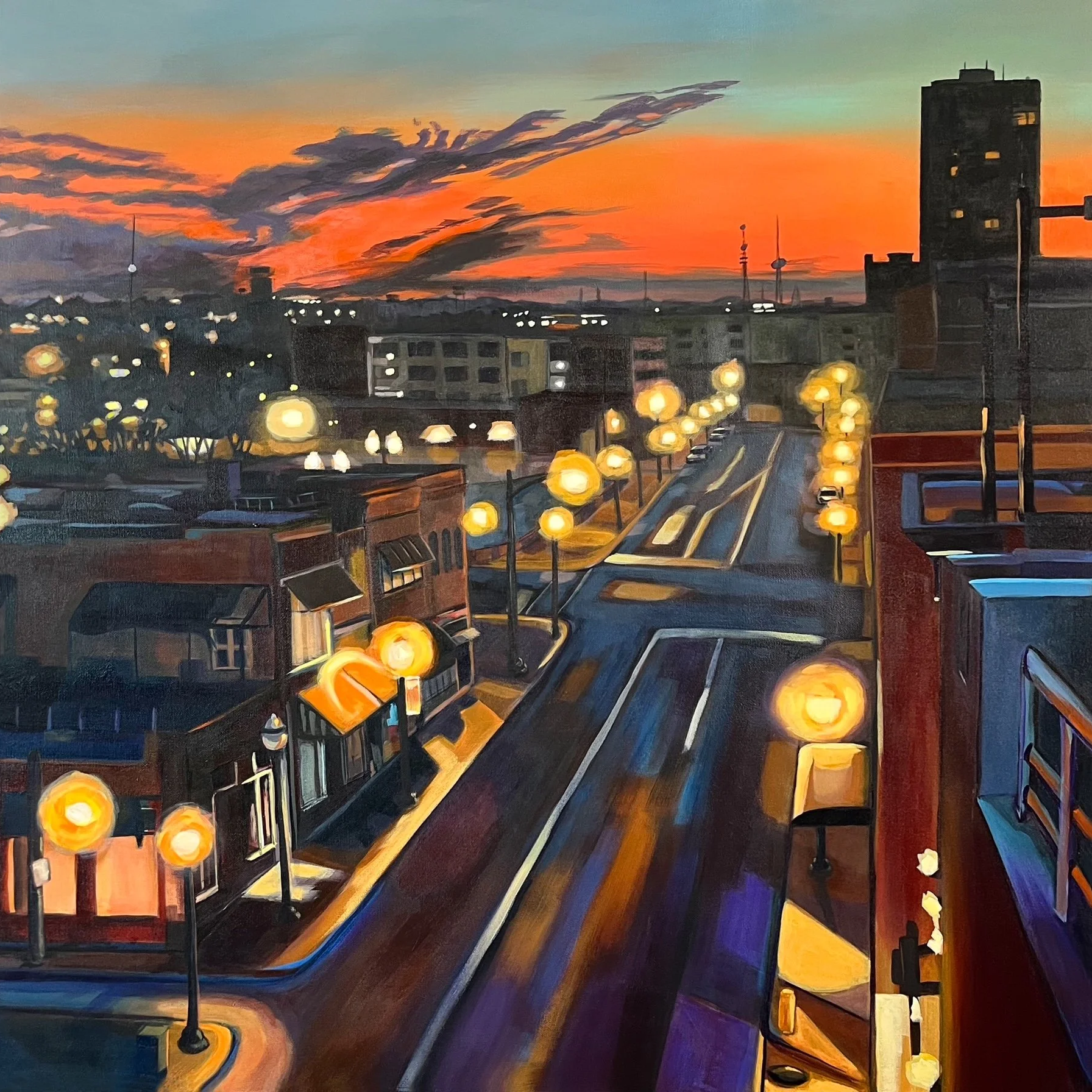Good Morning Springfield captures the quiet energy of the city just as the day begins. Streetlights still glow against the early morning sky, while the warm sunrise spreads across the horizon, illuminating the familiar rhythm of downtown streets.