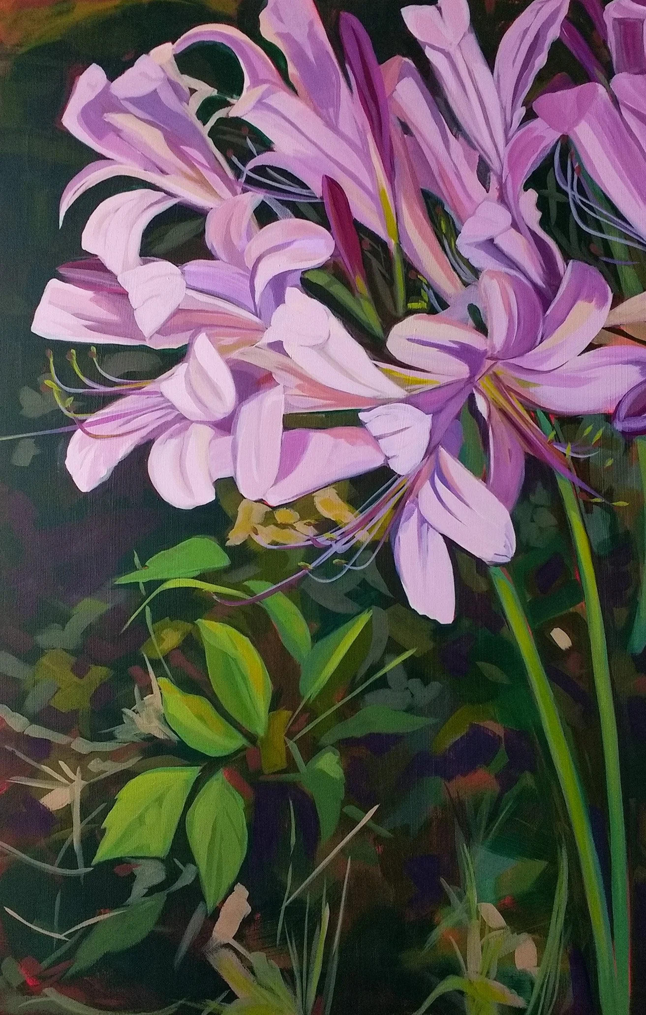 In Naked Ladies, the late summer lilies emerge suddenly from the grass, their tall stems lifting bright pink blooms into the light. The painting reflects the fleeting beauty of these flowers that appear almost overnight in the Ozarks landscape.